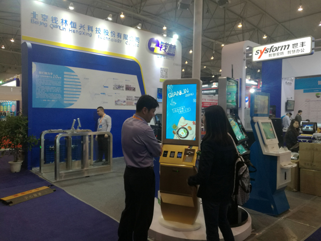 现在小编就带大家一起走进钱林展台,此次展会中,钱林展出了高端自助产品,包含17寸双屏台式访客机、台式14寸双屏访客、立式21.5寸双屏访客机、酒店自助入住机、自助点餐机等。