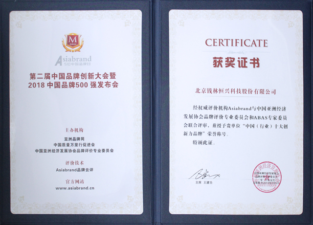 大会期间,隆重揭晓了“2018中国品牌500强、中国品牌日年度人物大奖、中国品牌年度创新人物、中国十大工匠品牌、中国十大创新力品牌”等榜单和奖项,并举行了隆重的颁奖仪式。北京钱林恒兴科技股份有限公司(证券代码:871112)凭借其超强的技术创新能力,以及技术创新成果转化能力,成功摘取“中国(行业)十大创新力品牌”殊荣!